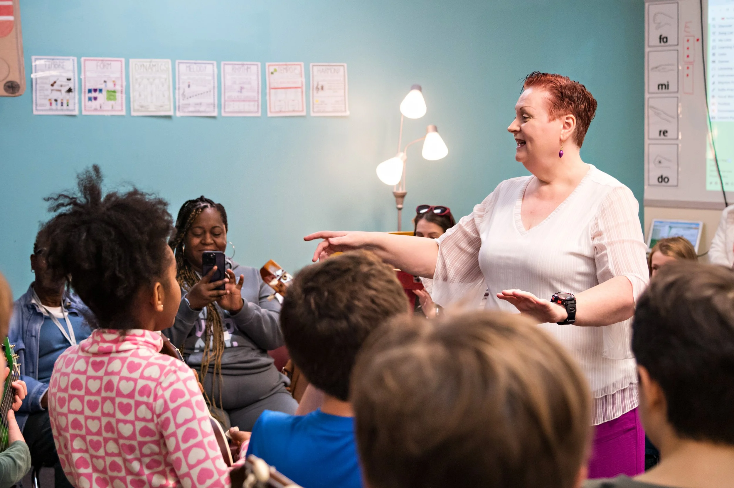 Students experience a broad variety of musical impressions and learn about ways to musically express themselves through singing, dancing, playing instruments, listening to music, and music theory.