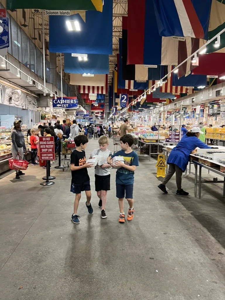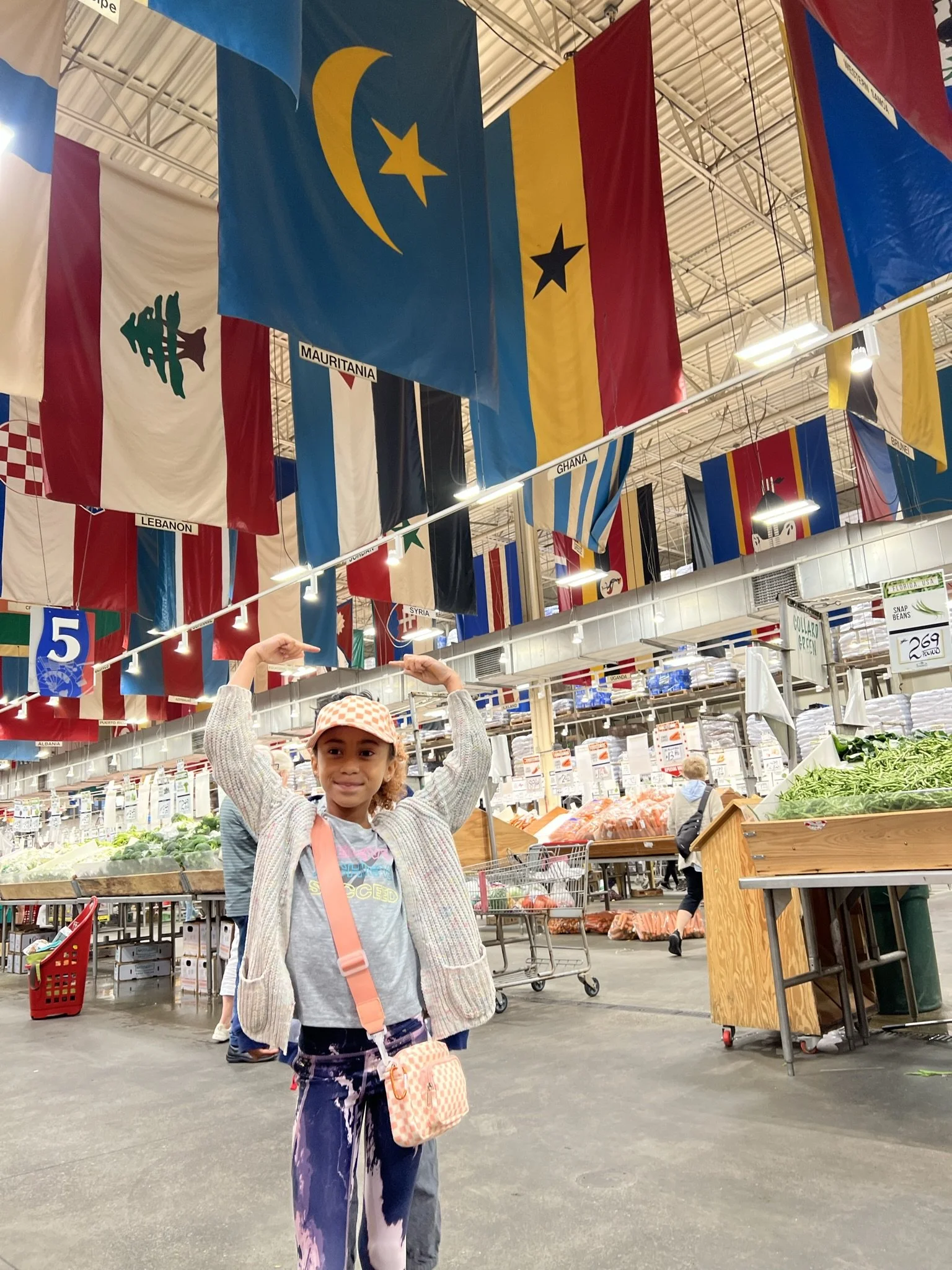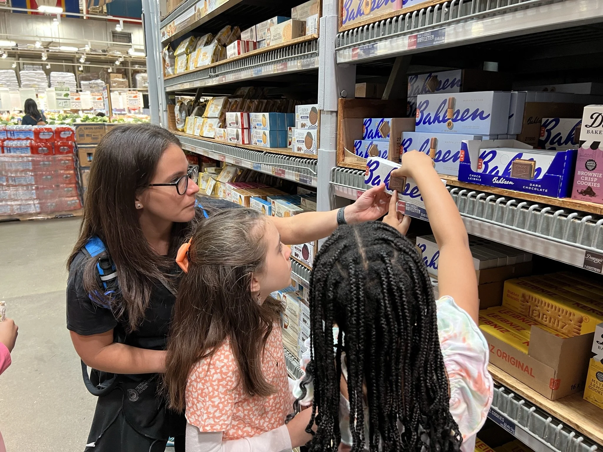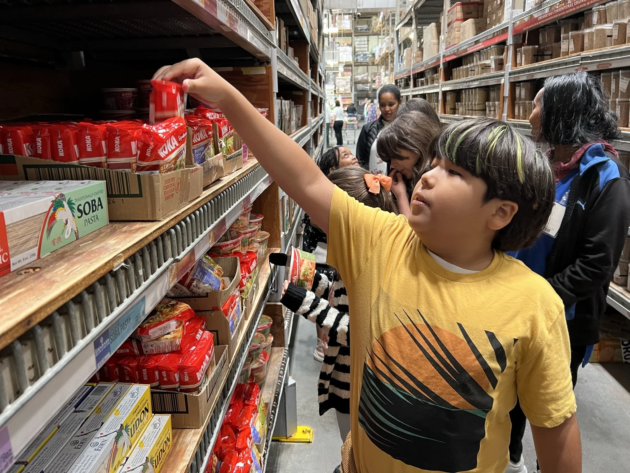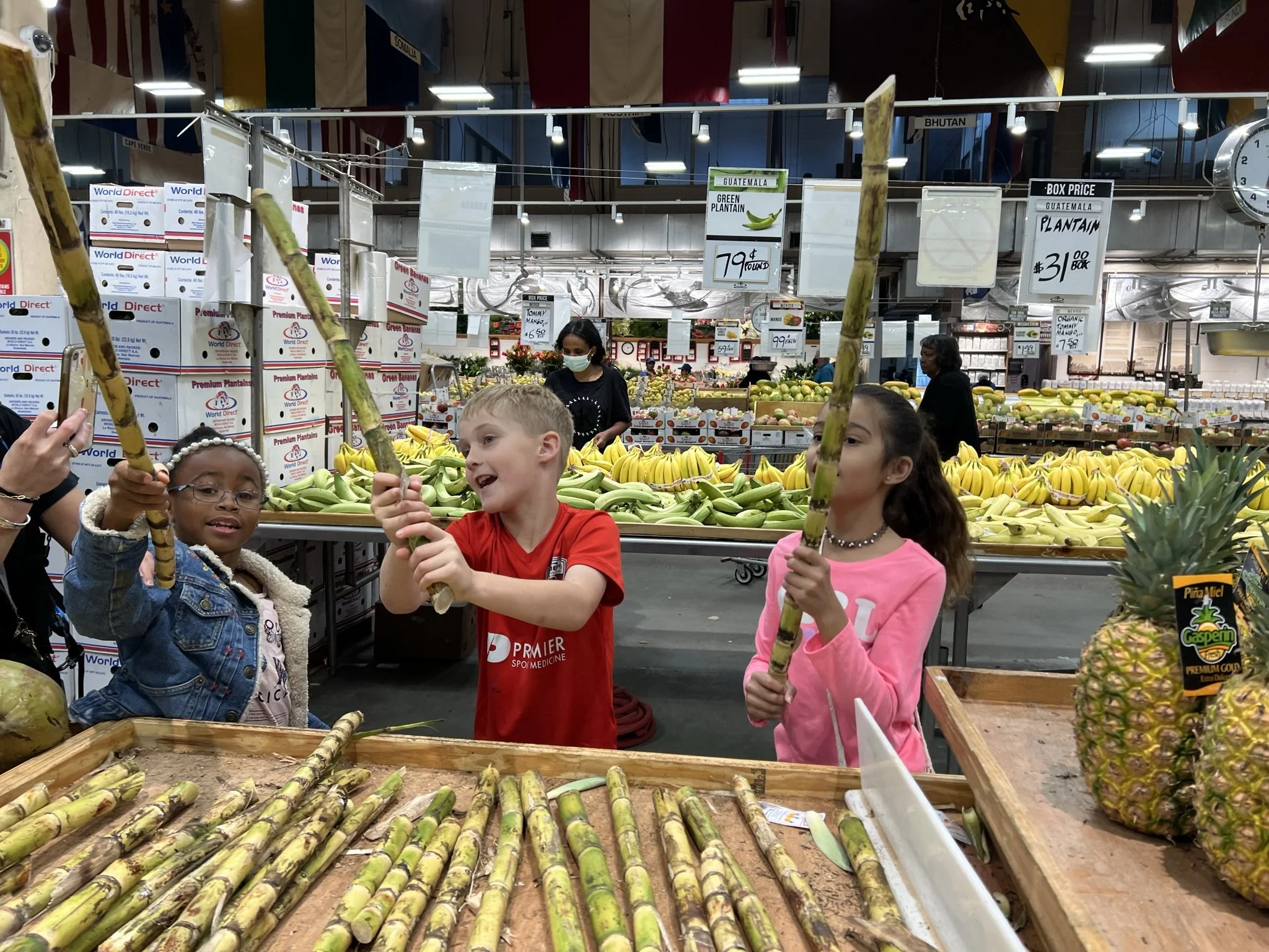 Next, the students split into three groups for a fast-paced A-Z scavenger hunt throughout the market that had them posing in front of the flags that represented their teacher’s home countries, comparing prices, finding produce and spices that start with specific letters, even a little exercising in the candy aisle!